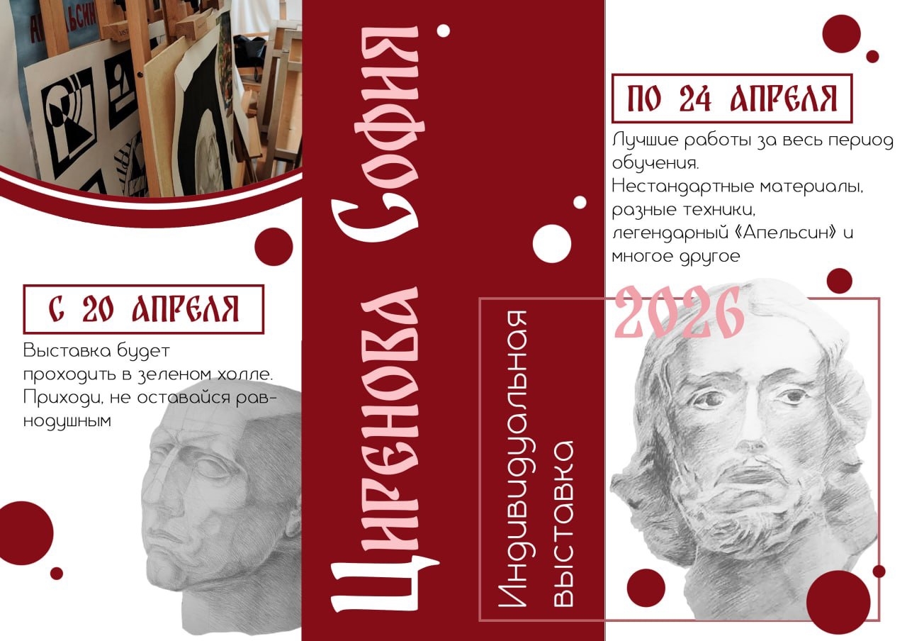 Друзья! С 20 по 24 апреля в рекреационной зоне на первом этаже проходит персональная выставка обучающейся студии изобразительного творчества Циреновой Софии под руководством педагога Бернаучис Маргариты Александровны